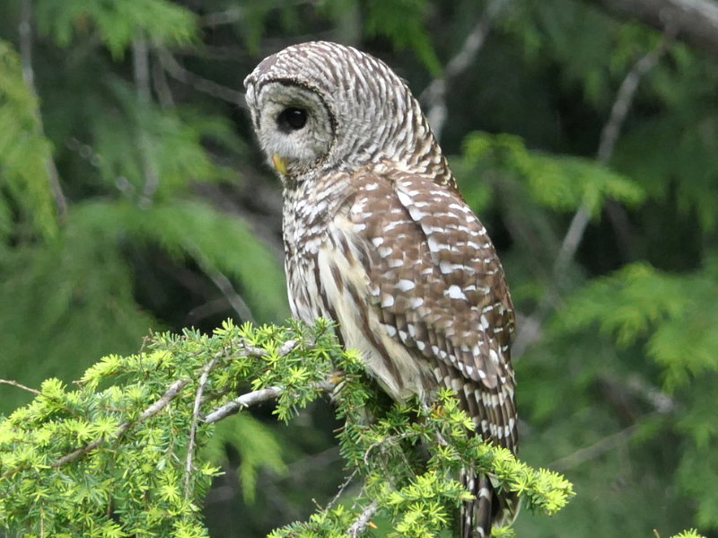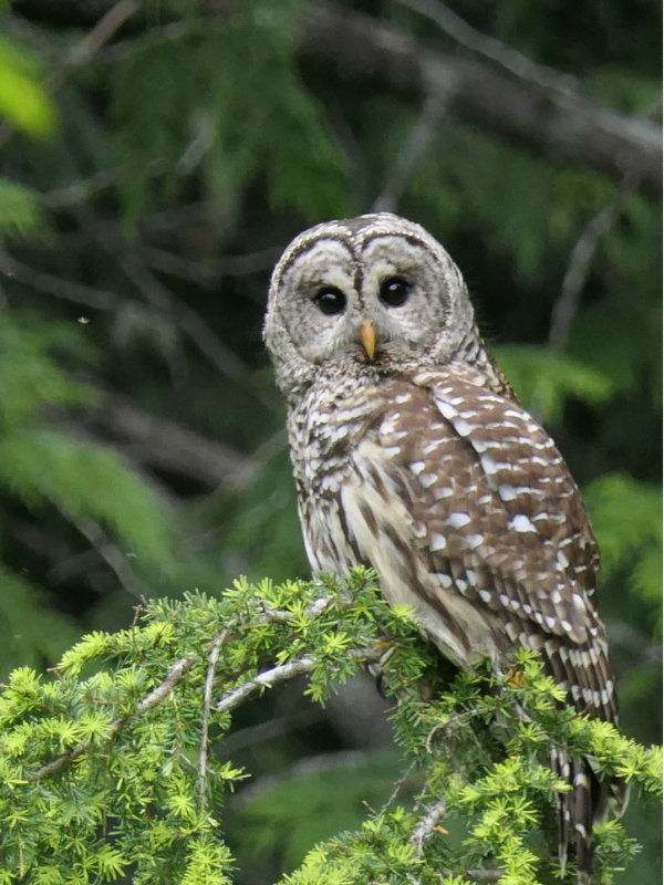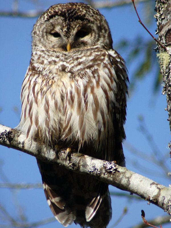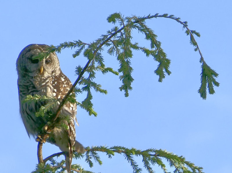 Barred Owls, native to the eastern United States, are common in the lowlands of the Olympic Peninsula, where they occupy the same niche as the smaller and endangered Northern Spotted Owl. To address the issue, the U.S. Fish and Wildlife Service created a management plan to reduce the population of Barred Owls in Washington, Oregon, and California. These photos were all taken on private property near Heart O' the Hills Area, Olympic National Park, Washington.