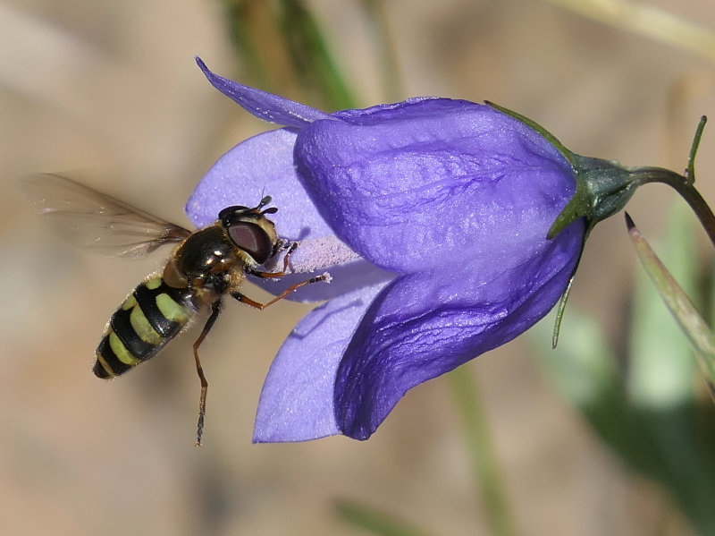 Flower flies, or hover flies, family Syrphidae, are common and abundant during warm weather. Many appear to mimic bees or wasps, but vary tremendously in that mimicry. Some can fool even an experienced human, at a distance at least. Others look like ordinary dark flies. To get a really good idea of the astounding variety of syrphid mimicry, see syrphids on bugguide.net.
