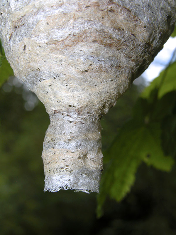 An early nest is about the size and shape of a ping-pong ball. In a few days, the female adds a tube extending downward (slide 2). After the first generation hatches, the original female continues to lay eggs while the first generation feeds prechewed insects to later hatchlings. They also enlarge the nest, building small chambers in the walls (slide 5). They are much more agressive than the female who originally builds the nest, attacking any person who comes too close. Adults feed on nectar and fruit. The paper made by Bald-faced hornets is very like paper made by humans by hand. It’s about the same thickness, and has the plant fibers oriented randomly. But hornet paper is laid down a bit at a time, so it ends up with streaks of different colors.