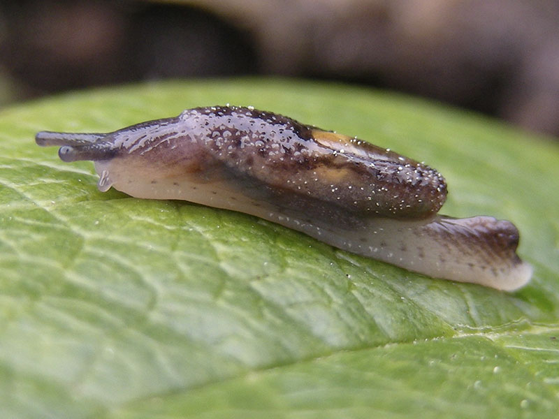 These two tiny slug species have small, almost covered shells. We have seen each species only once, years apart, but a dedicated search in and around rotting logs in the forest could turn up more. The small, light specks in the photos are pollen grains.