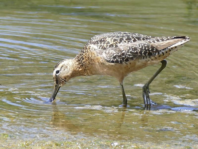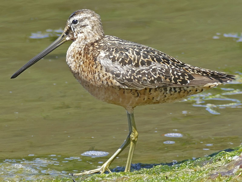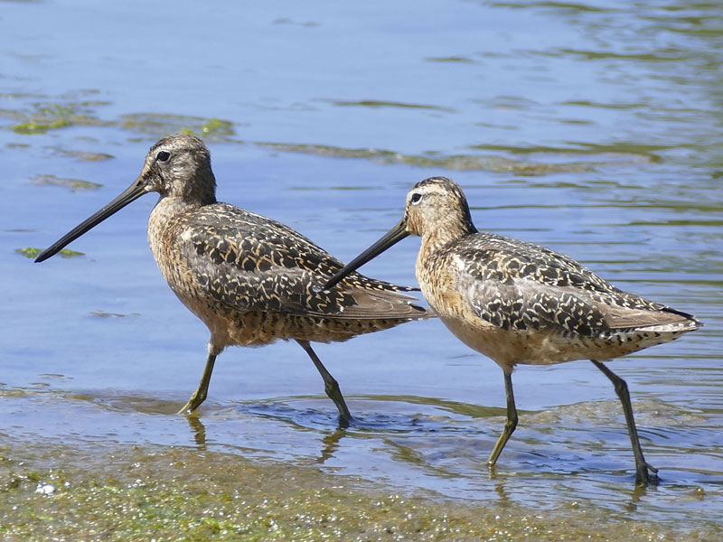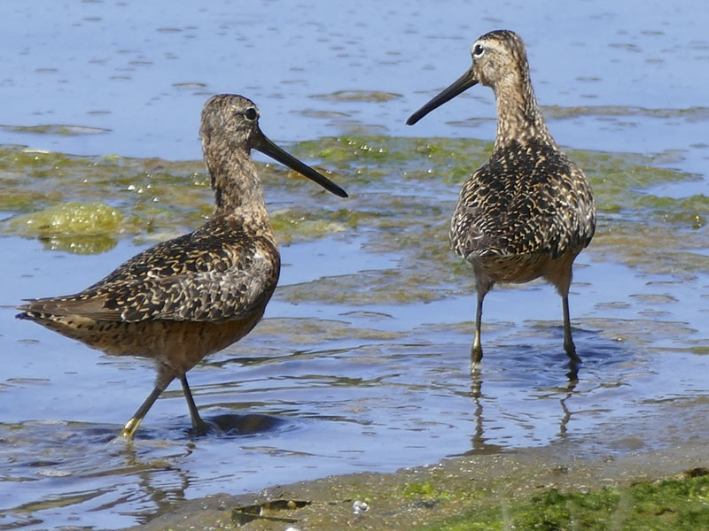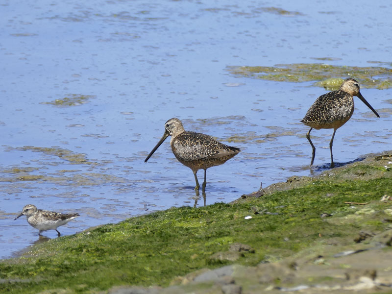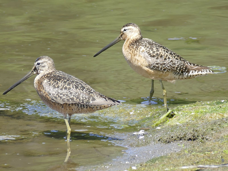 Long-billed Dowitchers are very similar to Short-billed Dowitchers, and guides say the best way to determine which species you are observing is by the call. But Pacific Short-billed Dowitchers have a distinctly white belly, and no white is visible on the belly of either of these birds in any of our photographs, so I think this is a safe identification. More from the Cornell Laboratory of Ornithology.