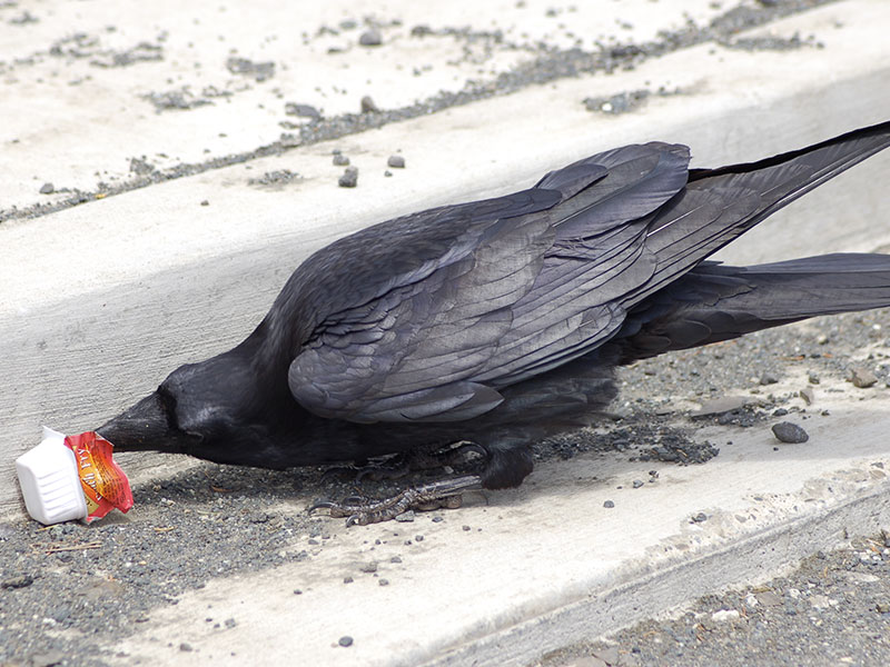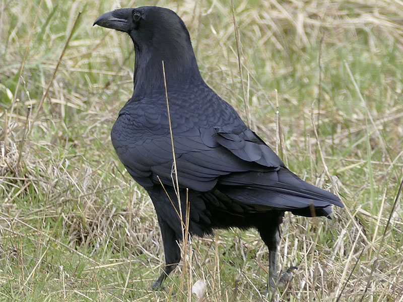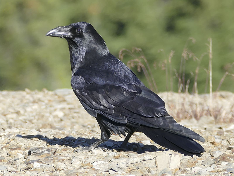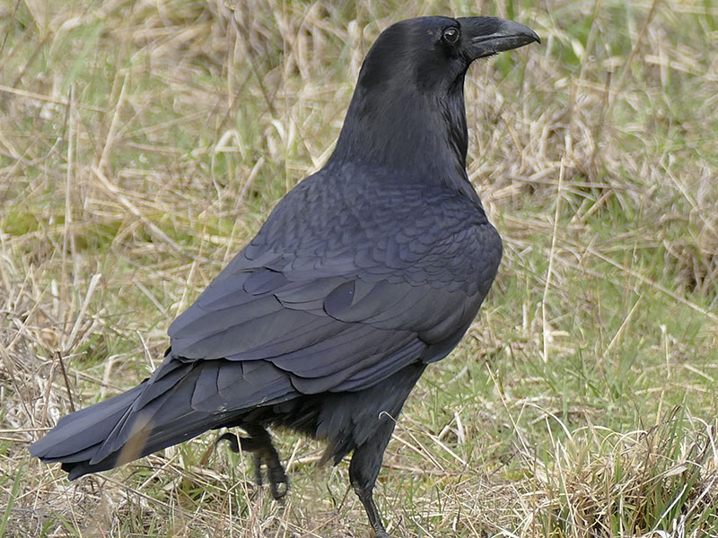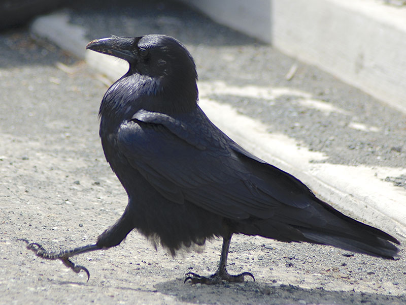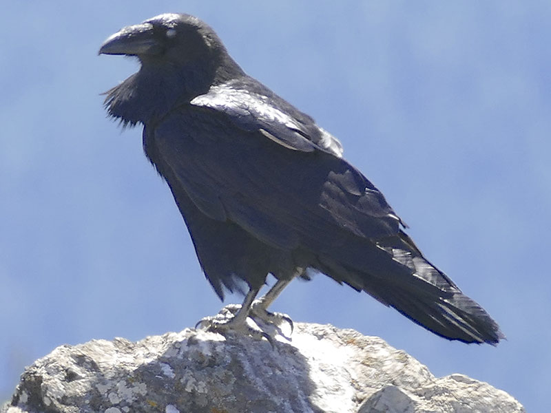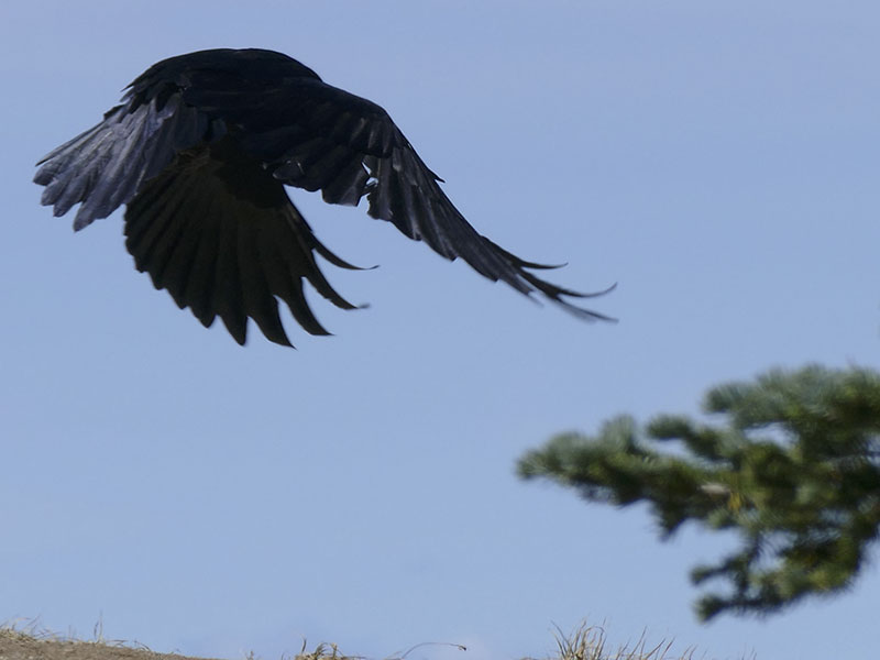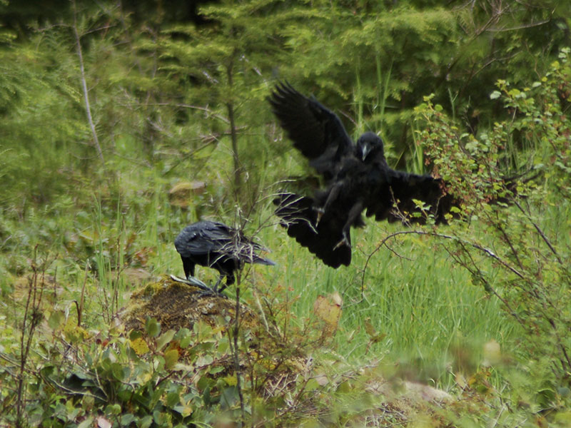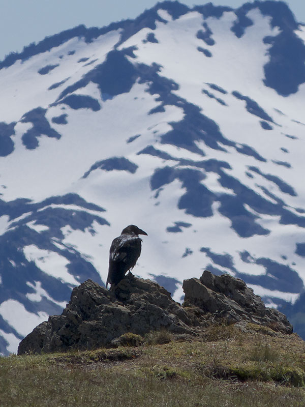 We see Ravens throughout the north Olympic Peninsula, from the highest ridges to sea level. They fly over our house, at about 2,000 feet elevation in the Heart O' the Hills Area, Olympic National Park, Washington, and roost in our trees. In the mountains, we often see them in small groups circling high overhead, and descending to feed. They are much larger than crows, with a wingspan more than 4 feet, a longer, heavier bill and sometimes obvious neck ruffs. Their calls are varied, but always loud.