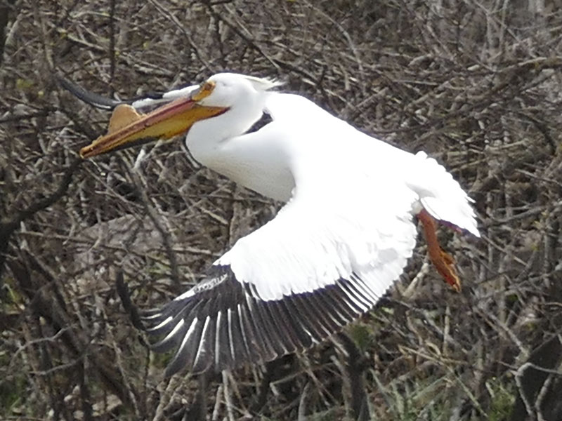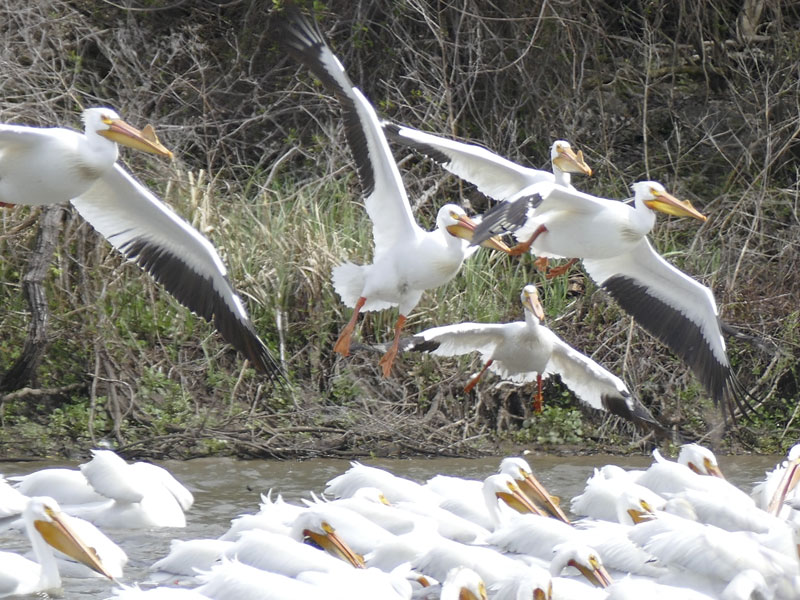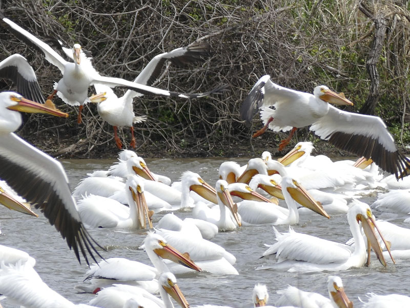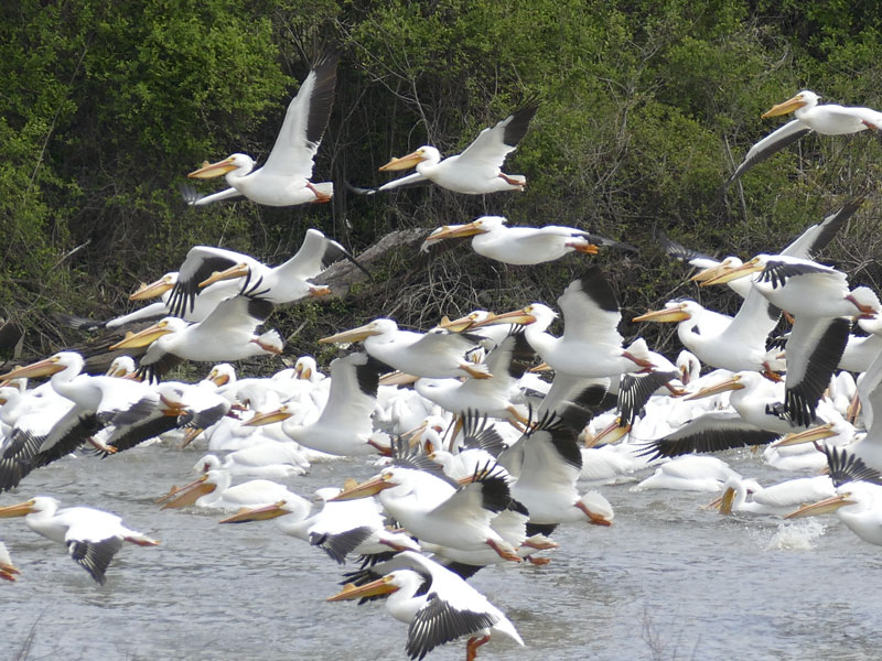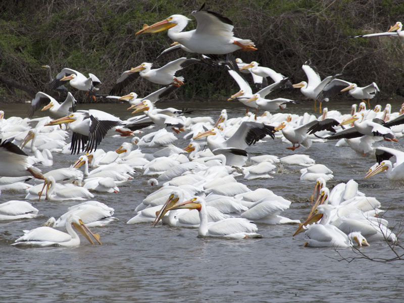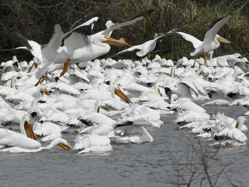 American White Pelicans migrate south for the winter, then back from the Gulf of Mexico in spring. The Middle Mississippi Valley is a favorite feeding spot as they fly north. They grow keels on the top of the bill in the breeding season. More from the Cornell Laboratory of Ornithology.