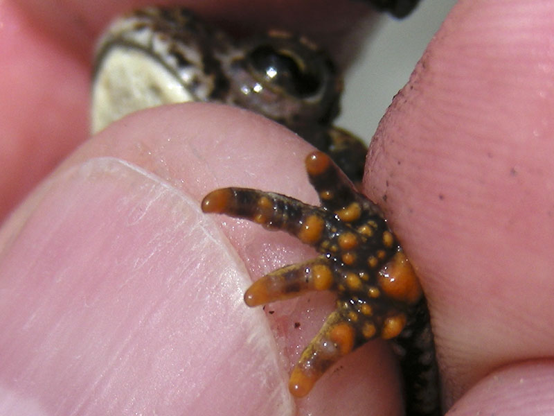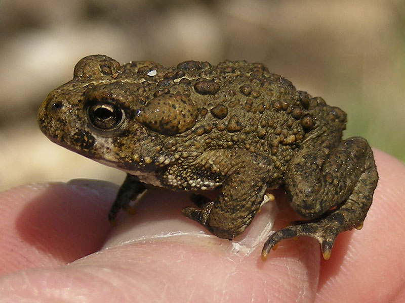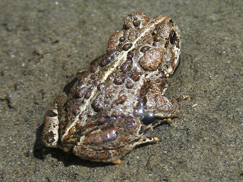 Juvenile Western Toads show the same field characteristics as adults except for size: cream dorsal stripe (barely visible or absent in newly metamorphosed individuals), prominent paratoid gland. Juveniles of all ages have bright yellow spots on their feet.