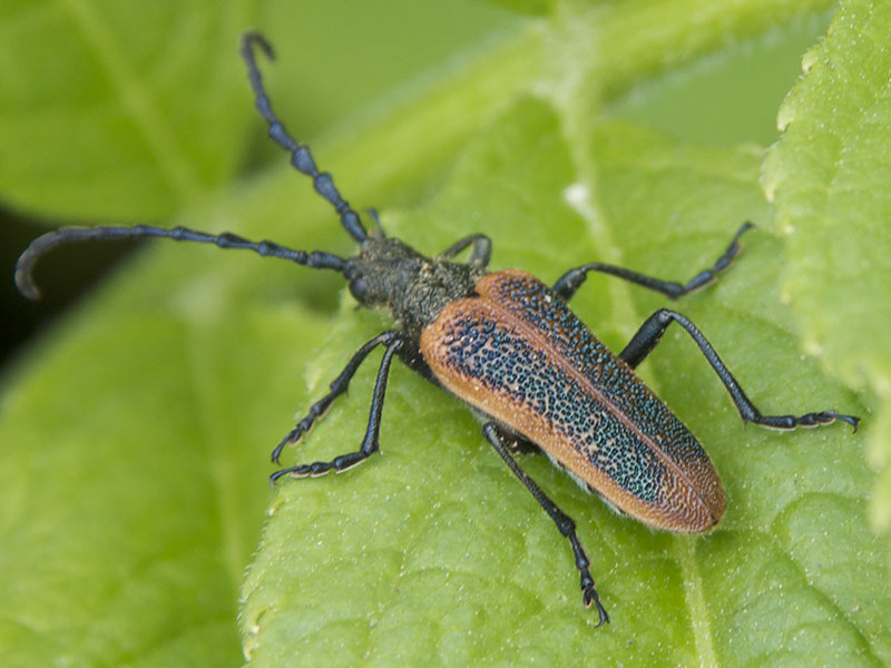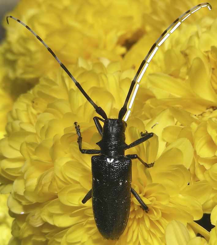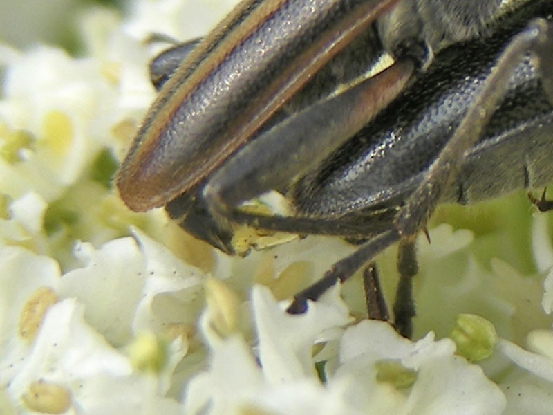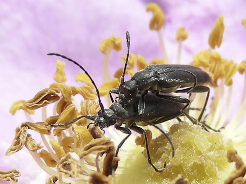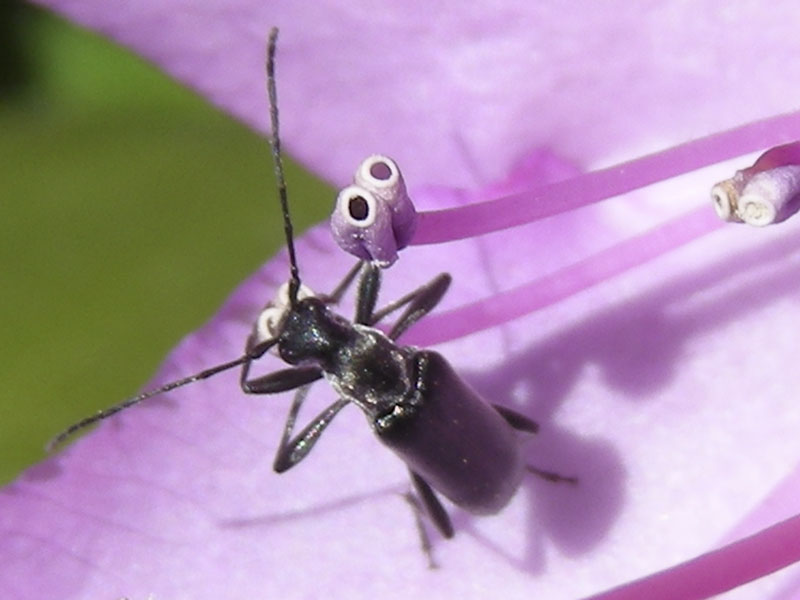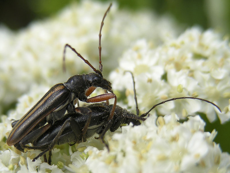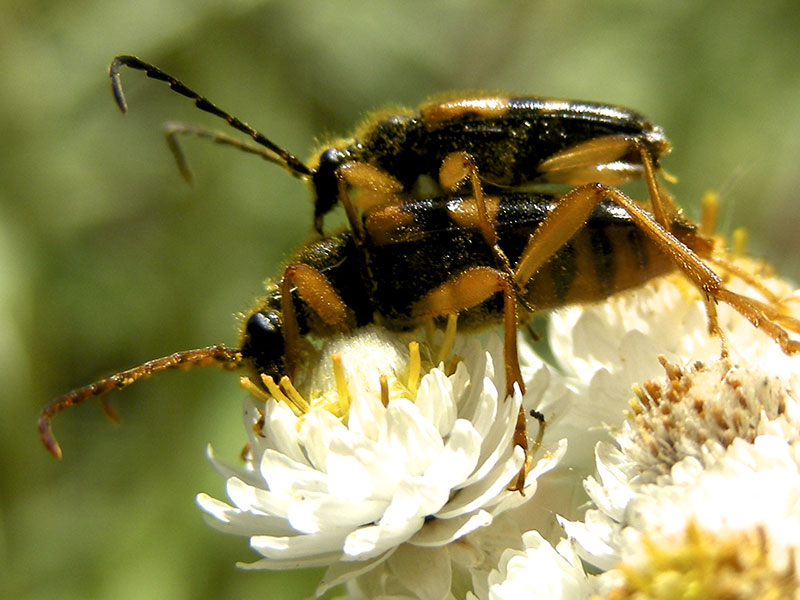 Long-horned beetles are common on the north Olympic Peninsula in the spring and summer. We see them on flowers or trees in the Hurricane Ridge area, as well as on flowers or even on the shingles of our house in the northern foothills of the Olympics. We have photographed a few species in addition to the ones on this page (see menu).