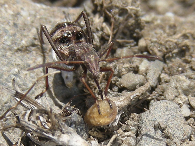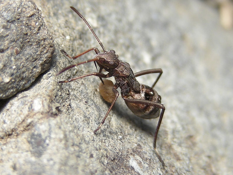 At times, the nymph stood still and moved its abdomen back and forth and waved one hind leg. Given the two big, black spots, we thought it looked like it was mimicking an ant, with the abdomen mimicing an ant head and the leg mimicking an antenna (video, slide 9). Broad-headed bug nymphs often resemble ants.
