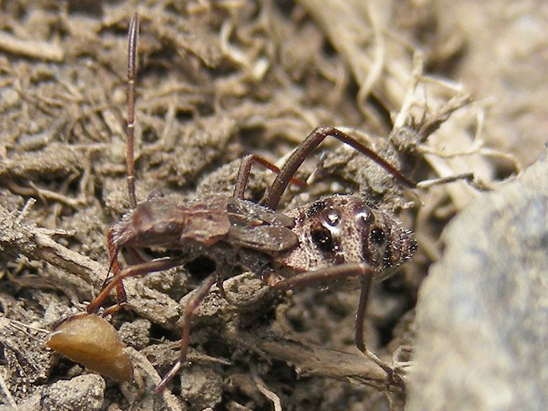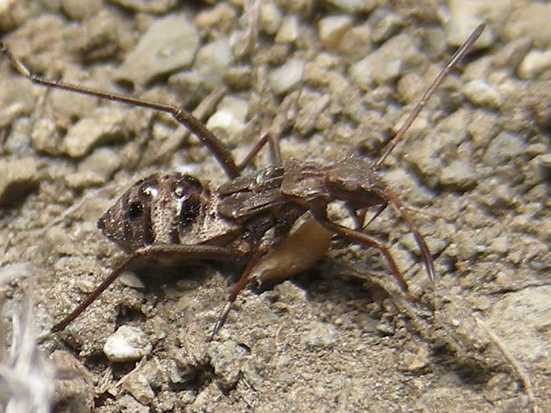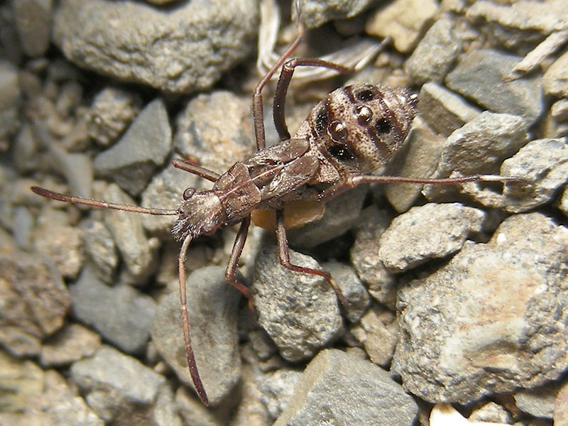 This Broad-headed Bug nymph was carrying prey—the yellowish ovoid—around for some time. My best guess is that it was a small pupa, but the photos don’t tell much. It’s possible that the bug had different items in different photos, but as far as we can tell, it carried only one around. The nymph itself was about 10 mm long. No species has been determined.