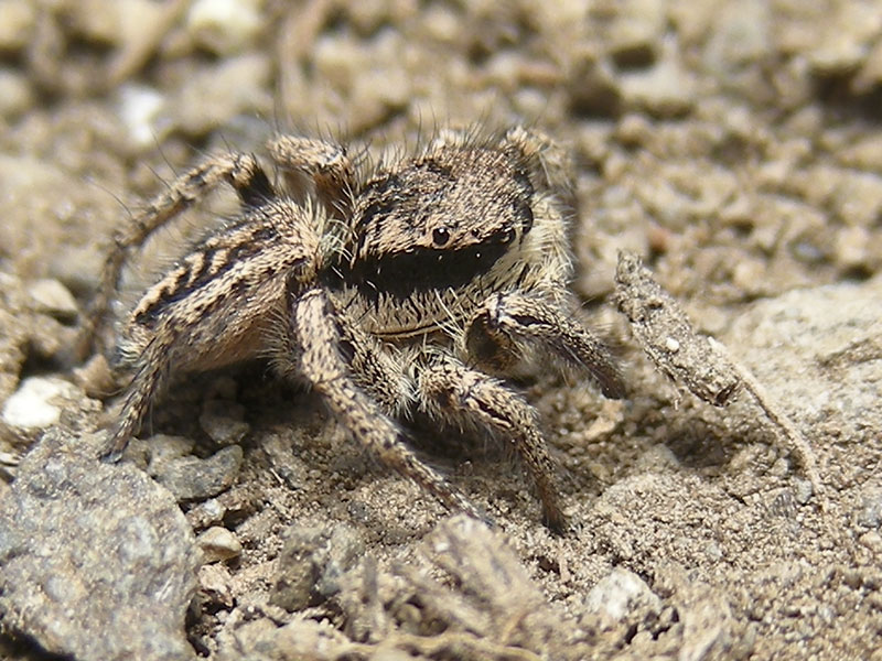 Watching this whole scene, and following the bug warily, was a female Habronattus americanus jumping spider. She never approached the bug, though she kept it in view for several minutes.