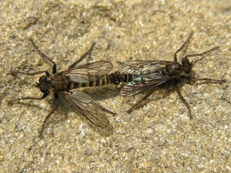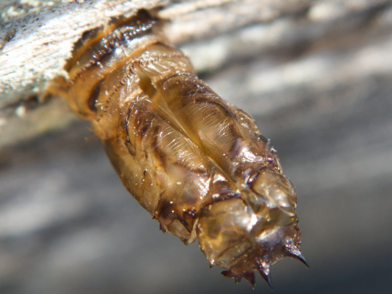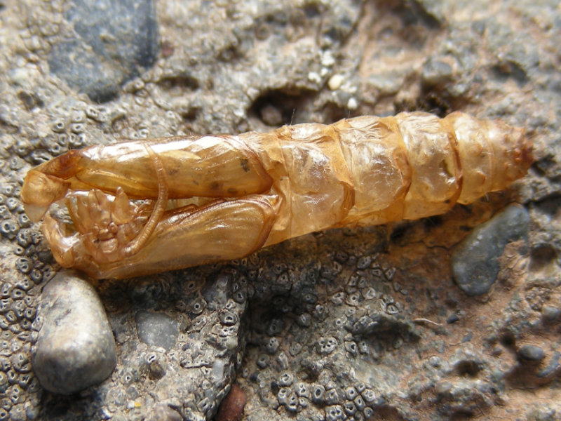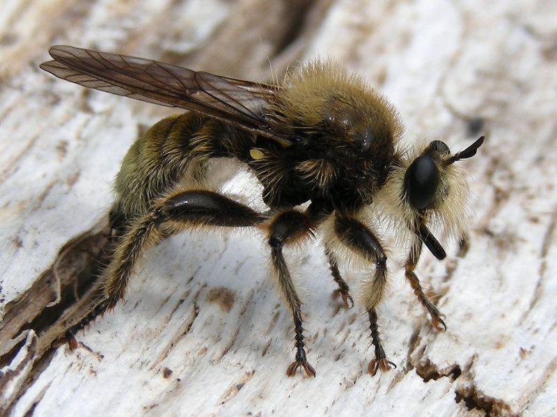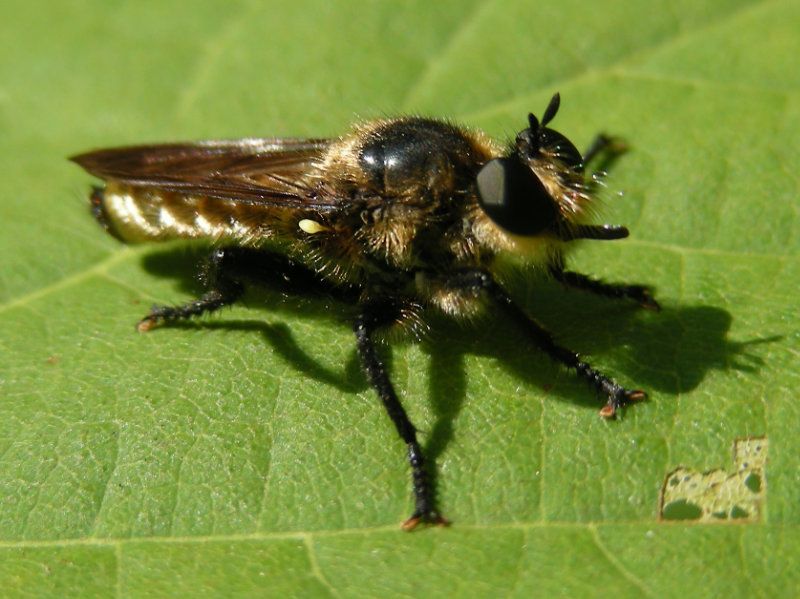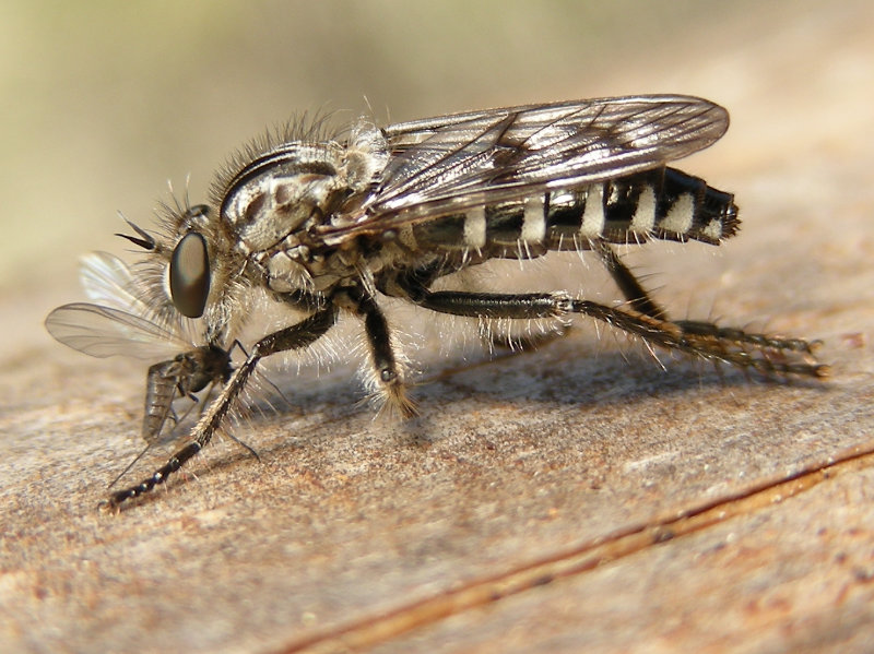 Robber flies typically overwinter as pupae, emerging in the spring. Some species prefer to lay eggs in old Wood-boring beetle holes (Family Buprestidae) in beach logs. The pupa wiggles partly out of the hole, then the adult splits the pupal case and emerges. (Slides 11, 12 and 13)