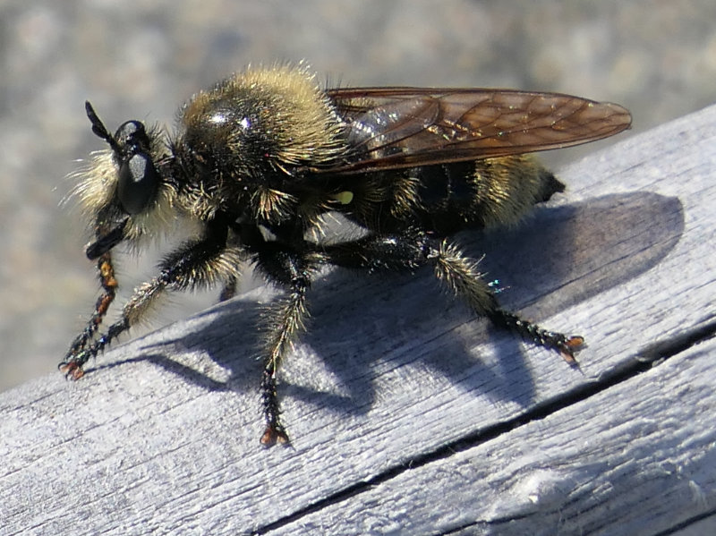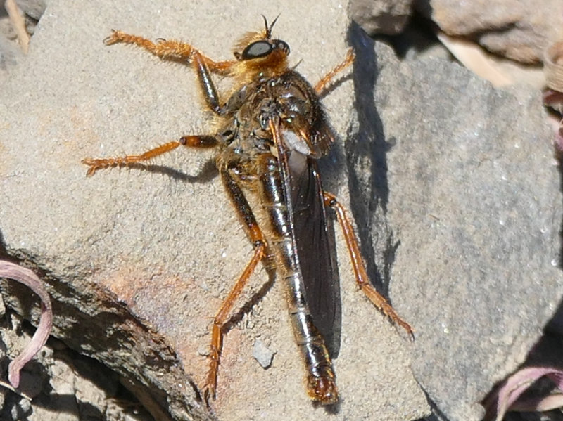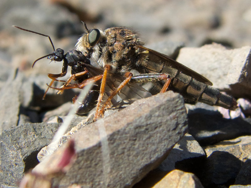 Robber flies (Family Asilidae) are predatory, attacking many insects, including some larger than themselves. The family contains about a thousand species in North America. Species vary in size, and some are bee mimics. Slides here are from sea level to more than a mile in altitude.