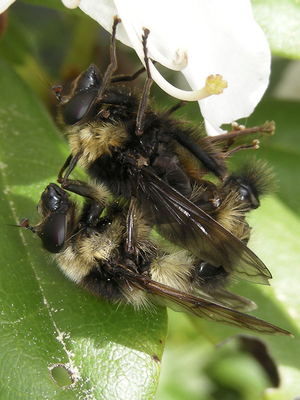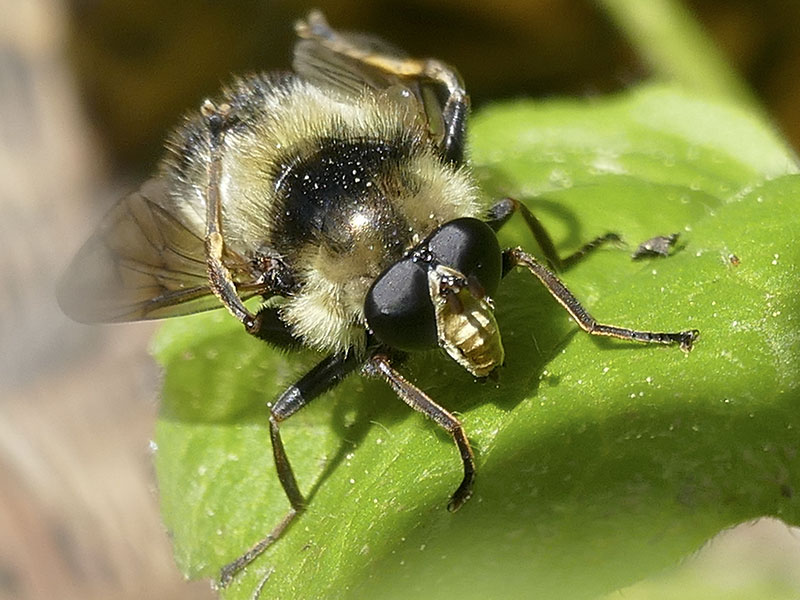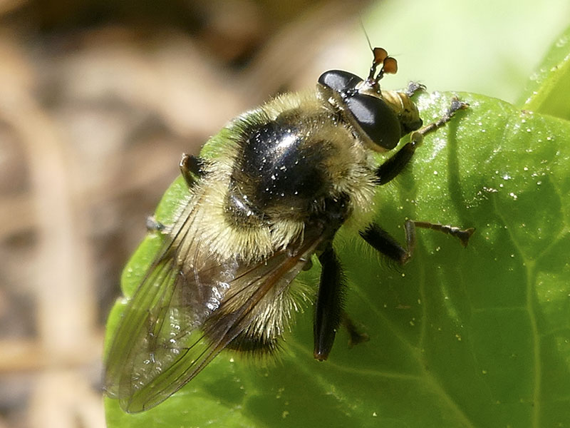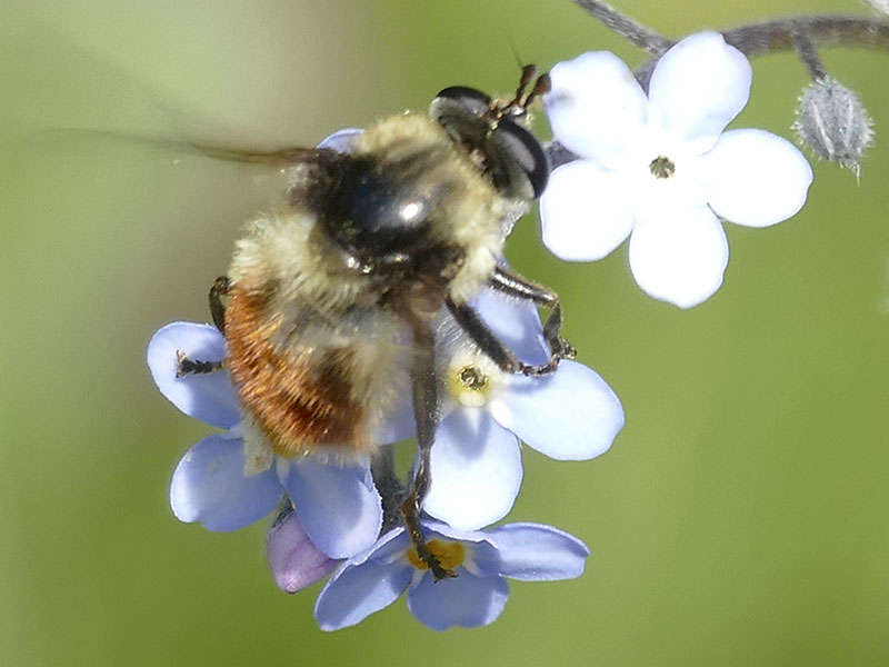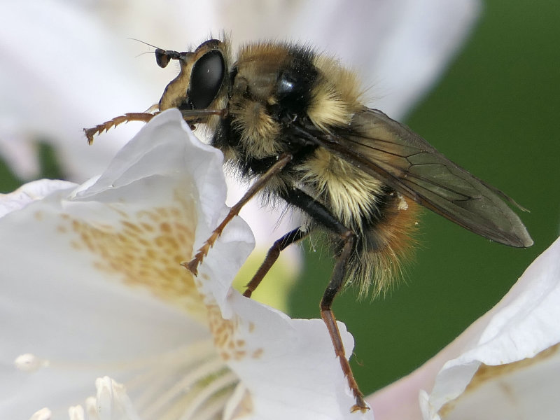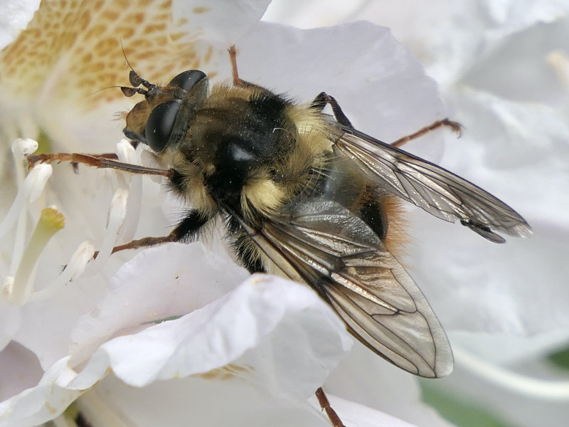 The syrphid genus Criorhina includes many large bumble bee mimics. At a distance, even a veteran insect watcher could be fooled. Viewing with butterfly binoculars or viewing close-up photos reveals the distinctive fly antennae and, possibly, the one pair of wings and one pair of halteres.