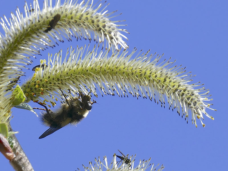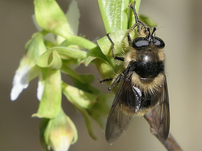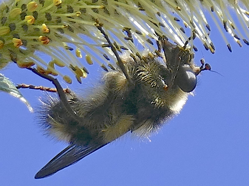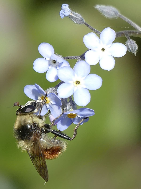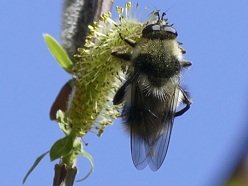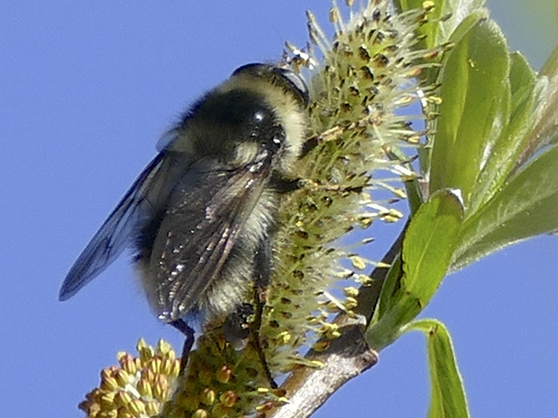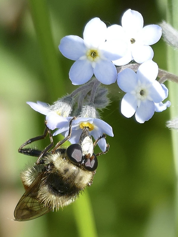 The syrphid genus Criorhina includes many large bumble bee mimics. At a distance, even a veteran insect watcher could be fooled. Viewing with butterfly binoculars or viewing close-up photos reveals the distinctive fly antennae and, possibly, the one pair of wings and one pair of halteres.