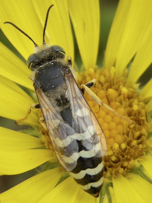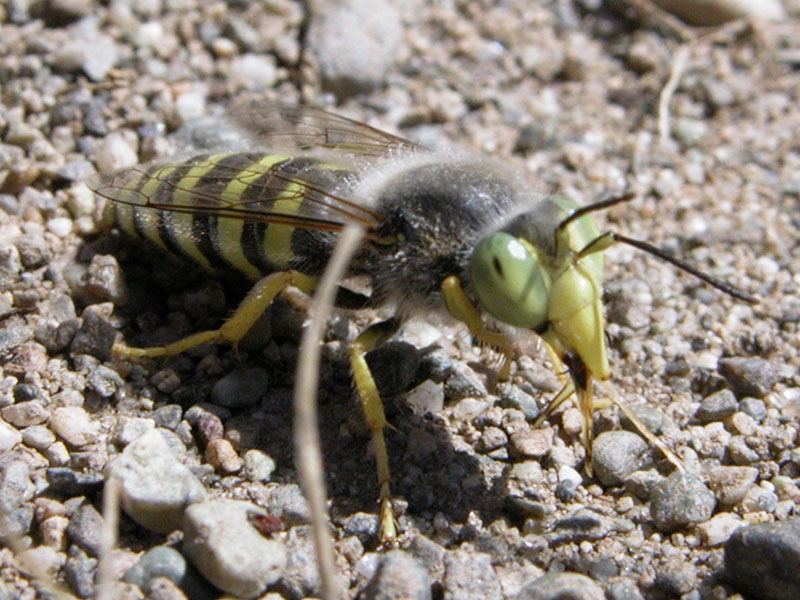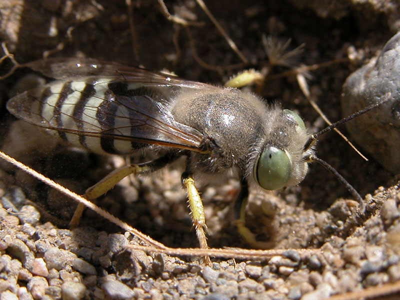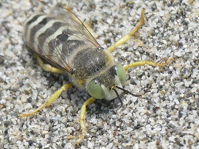 Bembix can be identified by the large green eyes, stout body with white or yellow zigzag stripes, close-set antennae and an elongate proboscis.