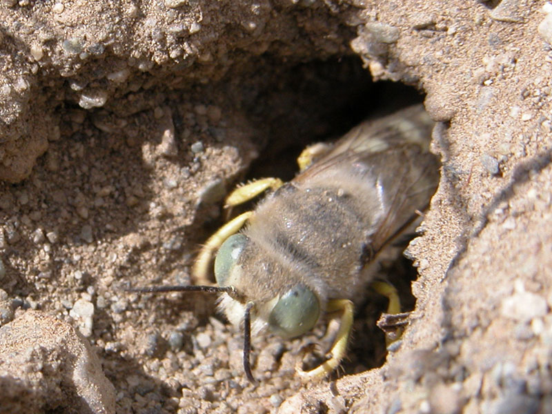 Bembix sand wasps dig holes several inches deep using the front legs, which have special adaptations for digging. When they leave the hole, they sometimes cover the opening. When they return to a covered hole, they may circle the spot several times, apparently recognizing landmarks. Then they excavate the opening to the hole again. This shallow oval excavation may be a centimeter long with the nest hole roughly in the center.