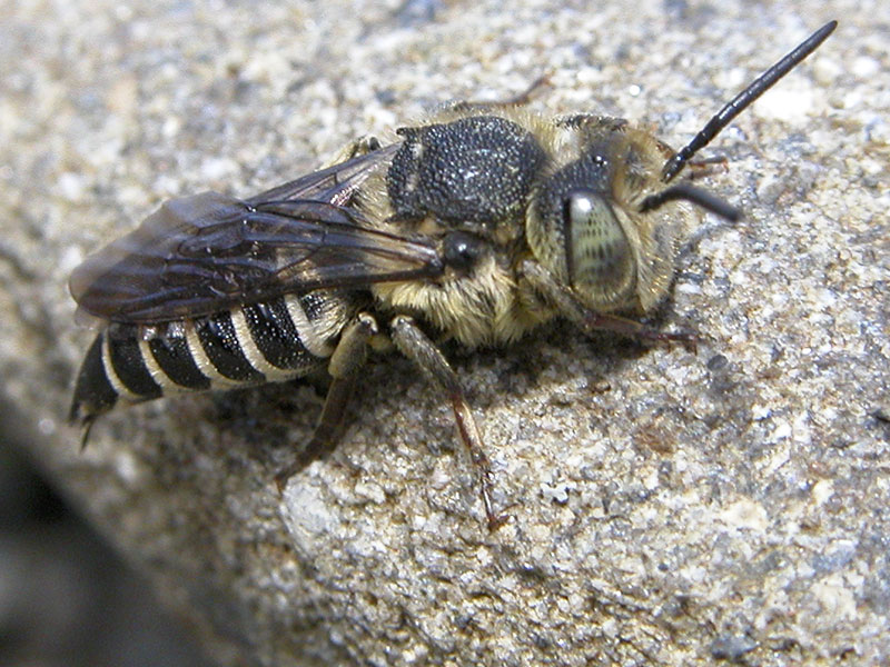 This was a Cuckoo leafcutter Bee, another megachilid, in the genus Coelioxys. They lay eggs in the nests of other bees, especially other megachilid bees. The larvae typically kill the host larvae (thus they are properly called parasitoids) and feed on the pollen stores. The name comes from the Cuckoo, a bird that lays eggs only in the nests of other birds.