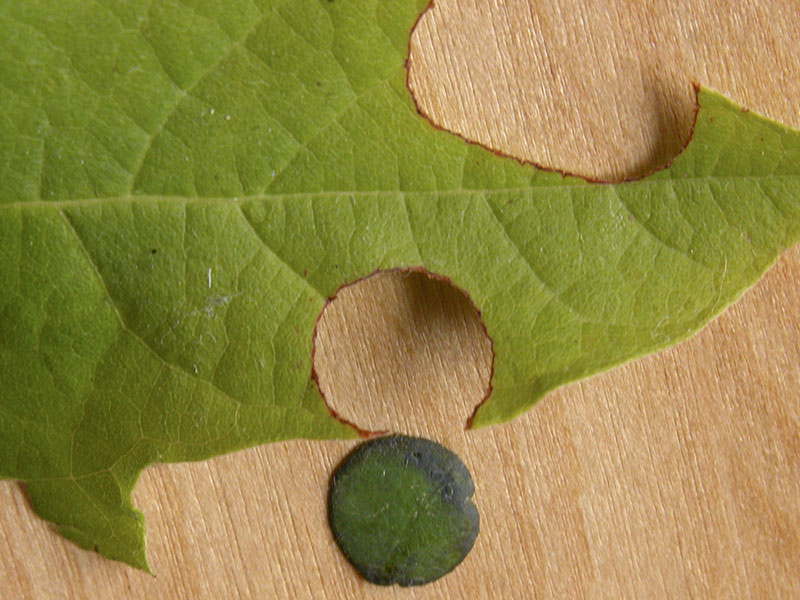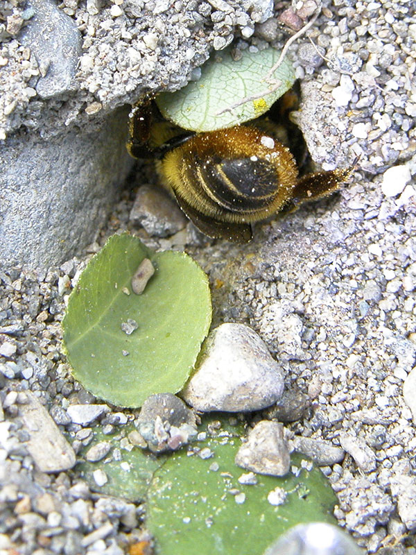 Borror, Delong and Triplehorn write, in An Introduction to The Study of Insects, 4ed, “It is not uncommon to find plants from which circular pieces have been cut by these bees.” Indeed, we did find a Bigleaf Maple nearby with leaf cutouts that exactly matched the size of the circular bits of leaf we saw under the rock (slides 4 and 5).