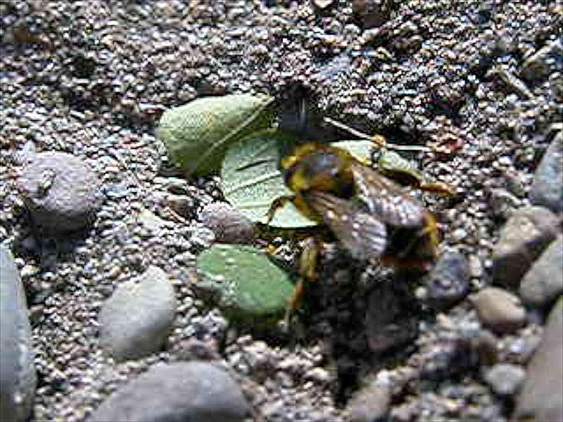 In early July, 2005, we walked along the bank of the mouth of the Elwha River, in Washington State, on a sunny day and saw a bee which seemed to be carrying something and circling around as if searching for something. We stopped and watched it until we saw it land near a rock. Gently lifting the rock revealed the bee in a hole in the sand. This was a Leafcutter Bee, (one of three groups in the Family Megachilidae). Leafcutter Bees typically line their egg-laying holes with bits of leaf, separating egg chambers with circular pieces of leaf. The first video shows this Leafcutter Bee emerging from her nest hole (slide 6)