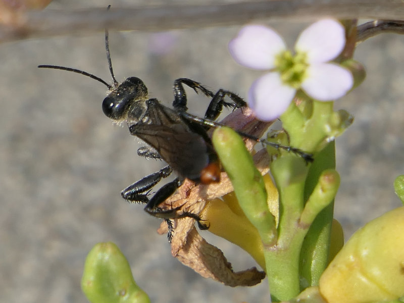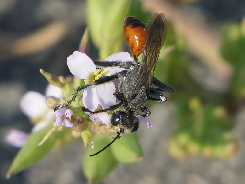 This large wasp, in the genus Prionyx, (from Greek, a saw) was patrolling European Searocket, Cakile marítima, and beach logs on the south side of Ediz Hook, in Port Angeles, WA.