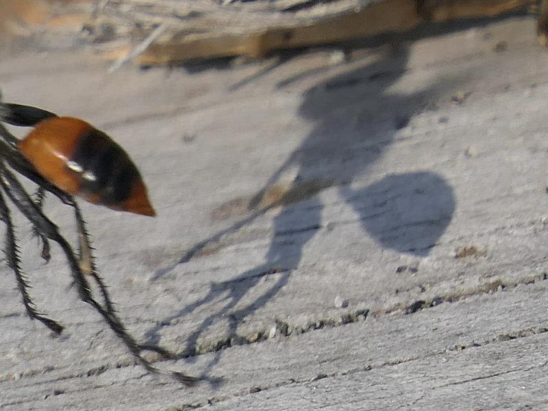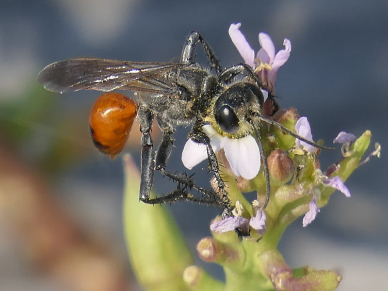 Adults feed on flower nectar. Females stock nests with adult grasshoppers (which were abundant in this location when we took these photos).