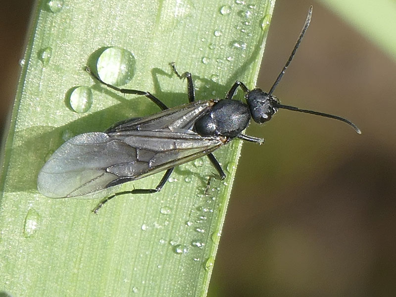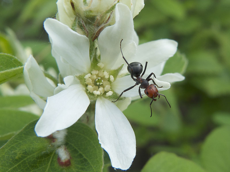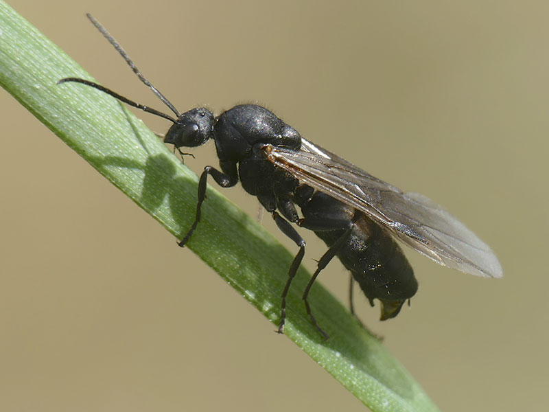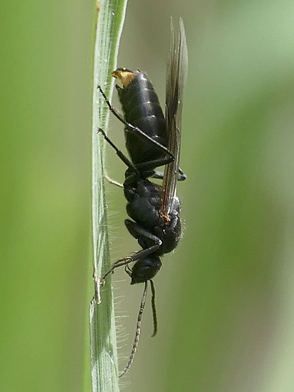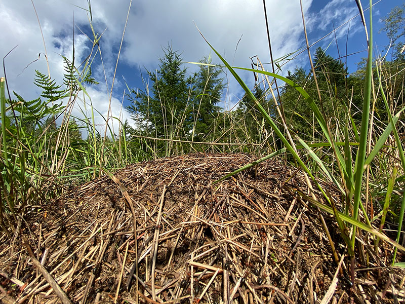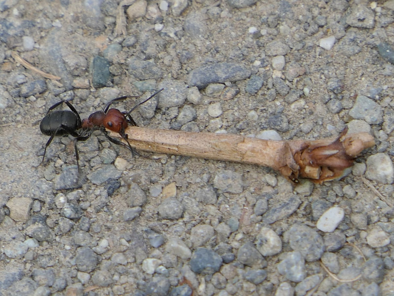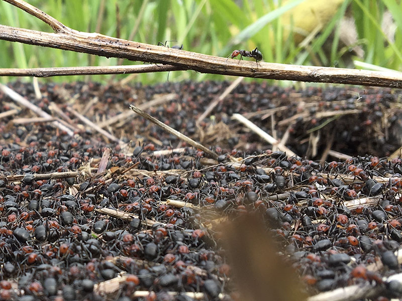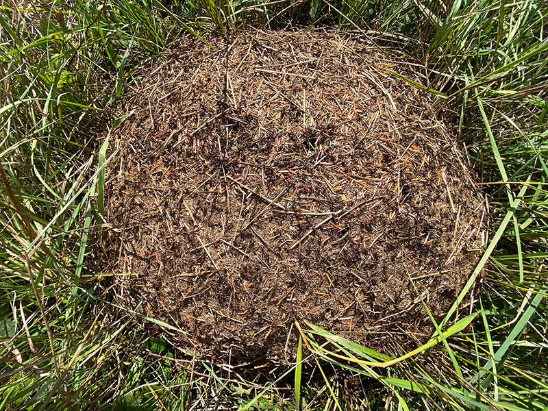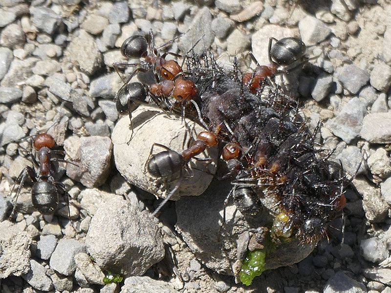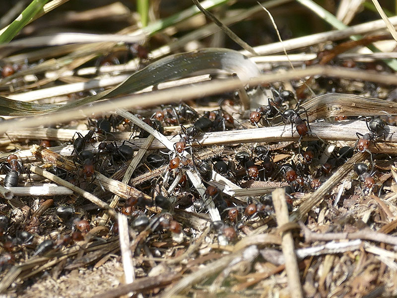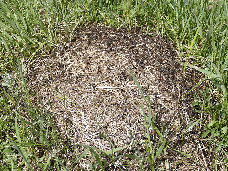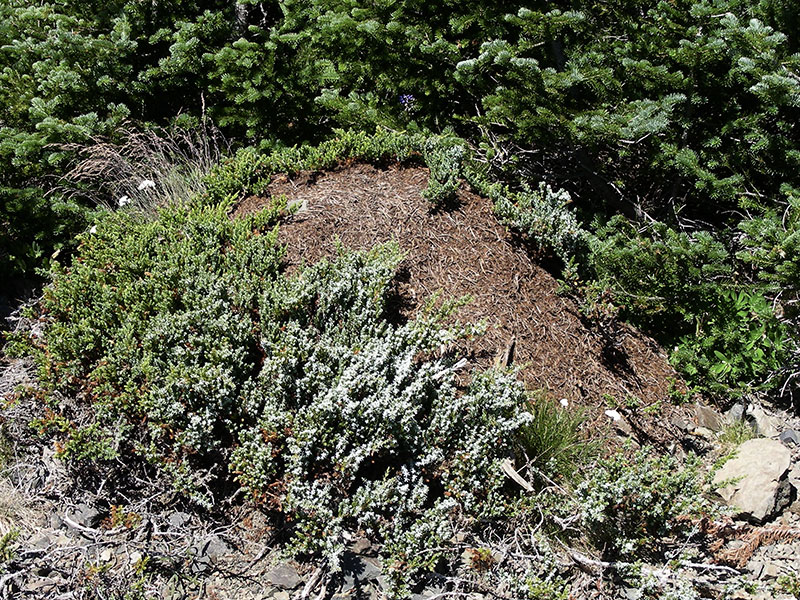 Among the many ant species in northern Washington State are these Thatching Ants, Formica obscuripes. They build large anthills of bits of grass and other stems. The hills can be three or more feet in diameter and reach more than a foot above ground level. They scavenge insects for food (slide 7). We’ve photographed Thatching Ants from near sea level to around 6,000 feet elevation.