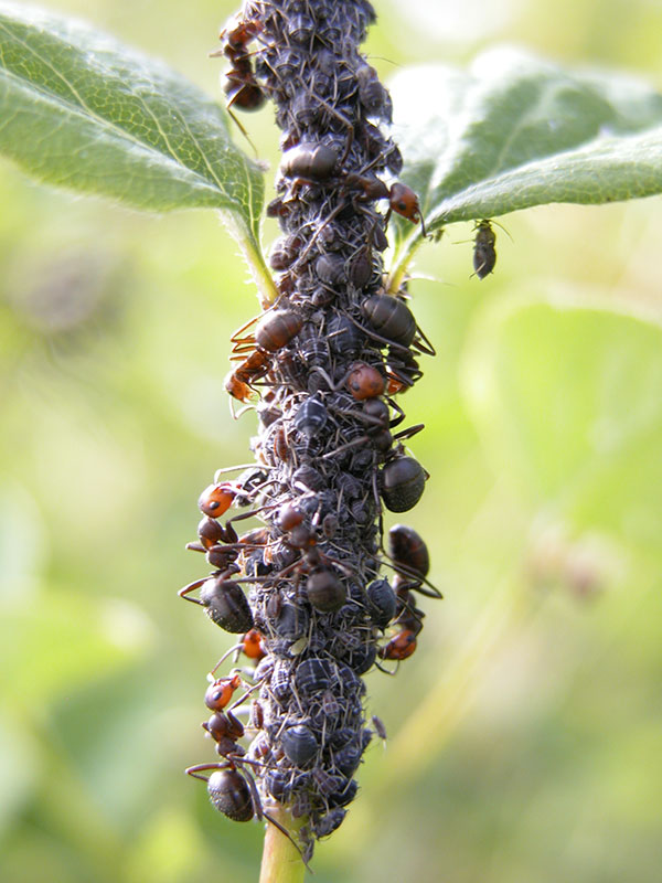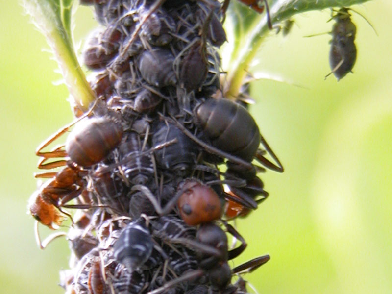 Many ant species maintain aphid colonies on trees and other plants. Thatching ants and many close relatives particularly exhibit this behavior (slides 14 and 15). When an ant touches an aphid with its antennae, the aphid excretes a droplet of honeydew from its anus. Honeydew is a valuable source of amino acids, carbohydrates, and water. Workers collect honeydew and return to the colony to feed the brood and queen. In one intensively studied Thatching Ant colony, a single worker repeatedly returned to a particular group of aphids even after being moved many meters away. Honeydew Harvest in the Western Thatching Ant