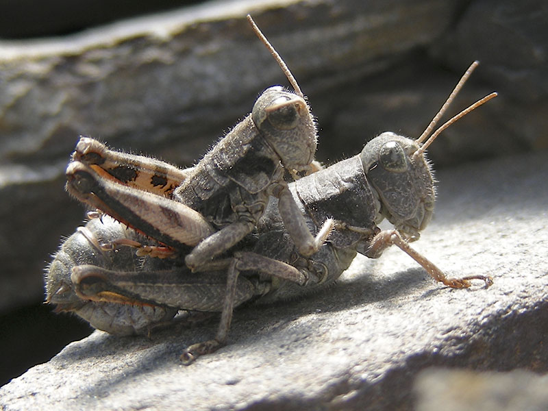 During mating, the male clings to the female, who can still jump. His abdomen is twisted around and under hers. Males also continue to cling to mated females, in a behavior called mate guarding.