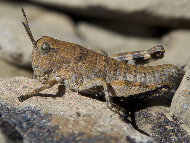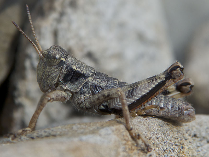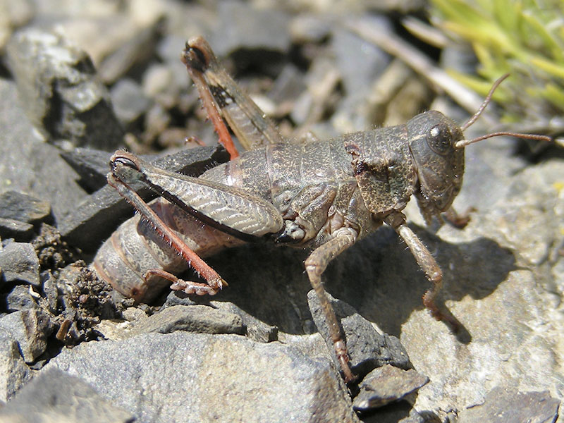 Since then, we’ve studied and photographed the grasshoppers every summer at several locations between Blue Mountain and Hurricane Hill. They favor large, dry scree at the edges of low foliage and seem to be distributed extremely locally. All of these sites are above treeline (see location information below).