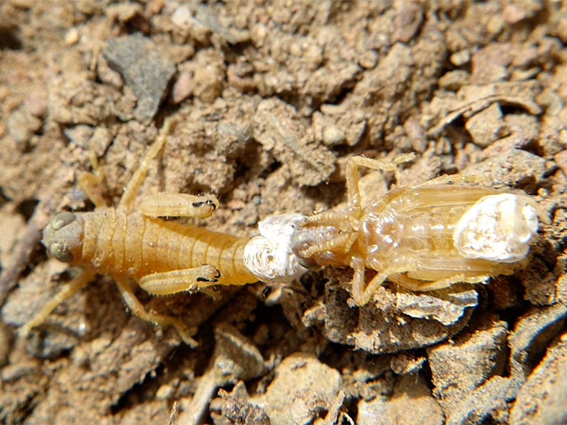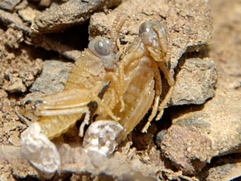 On 06/25/14, we were lucky enough to observe ten or more first instar Nisquallia olympica emerging from the ground after hatching from underground eggs.