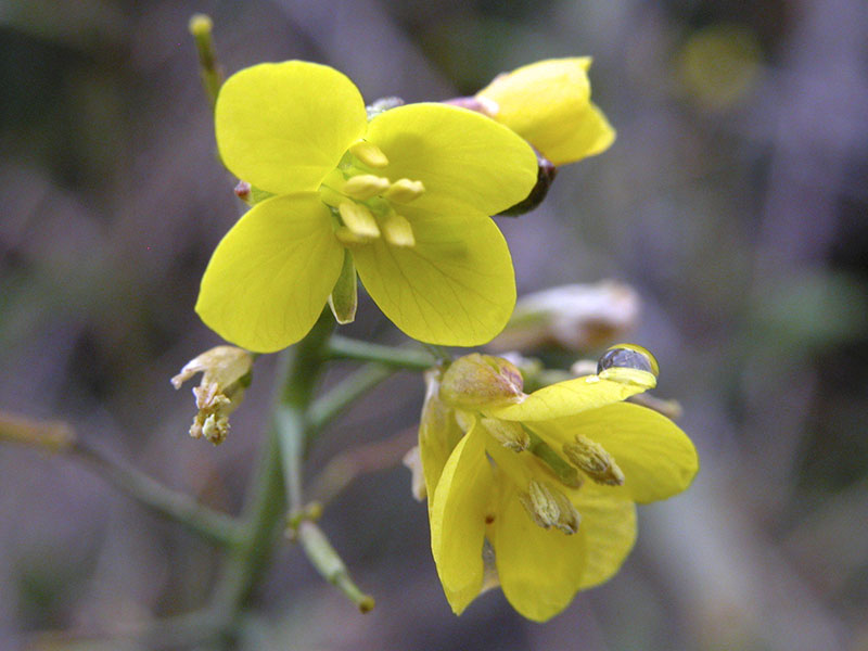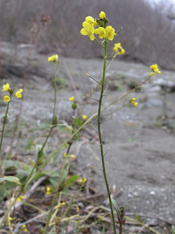 A non-native annual, Field Mustard, also called Rape from the Latin for turnip, Brassica rapa (or Brassica campestris), grows all along the northwest coast of the United States and Canada, frequenting low-elevation disturbed sites. (Varieties grow all over the United States.)