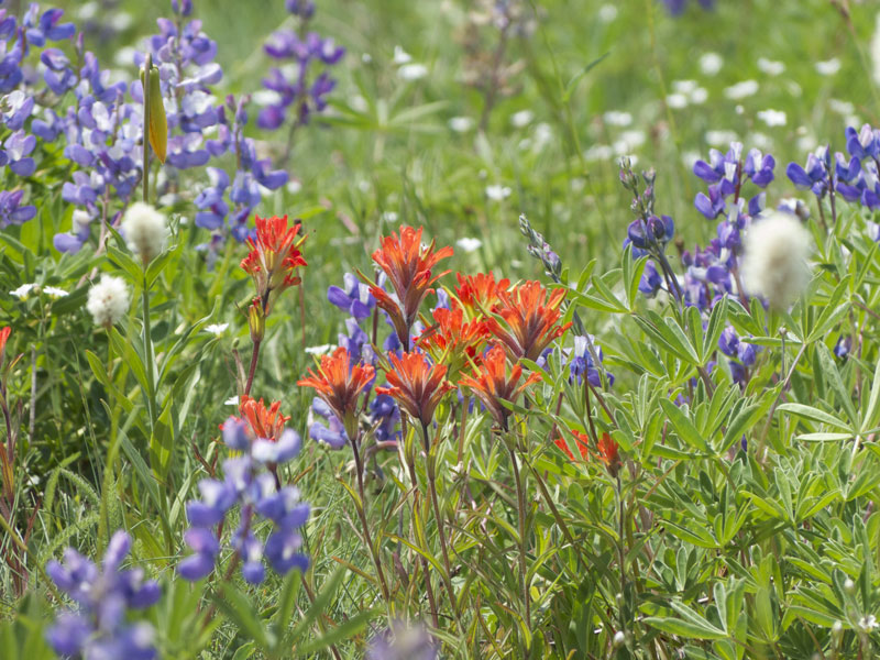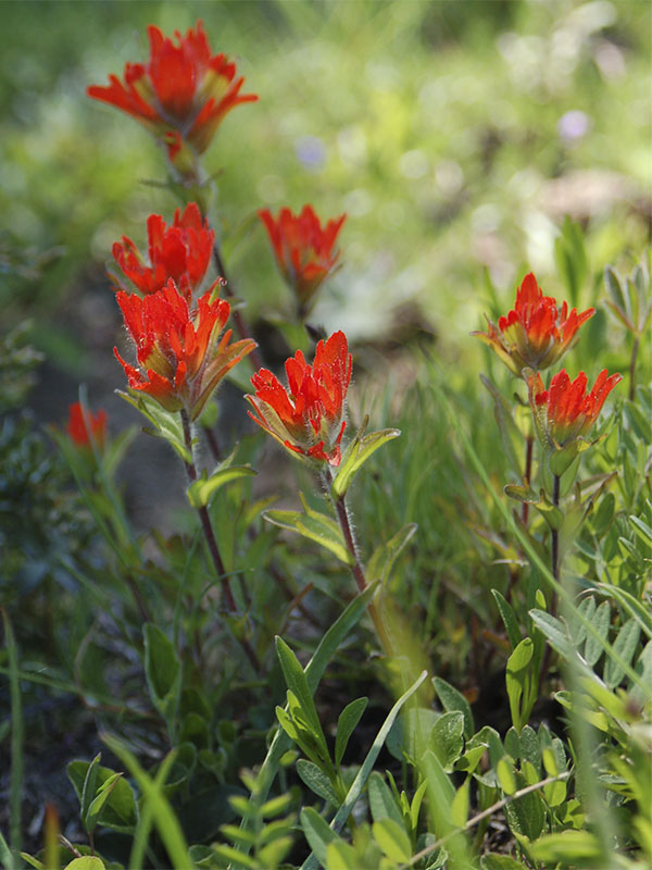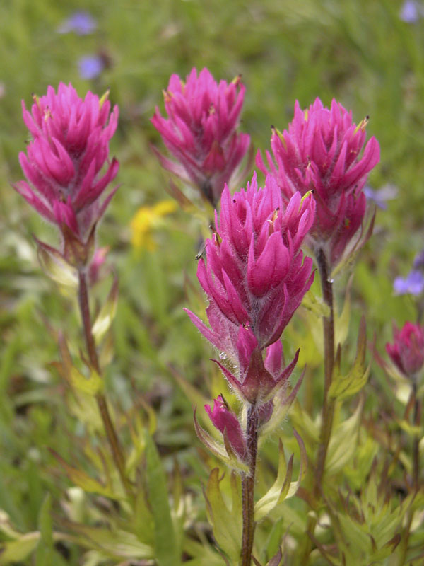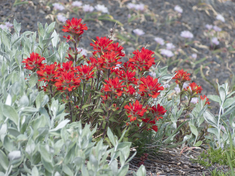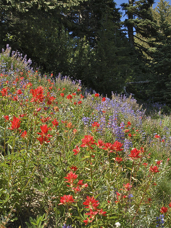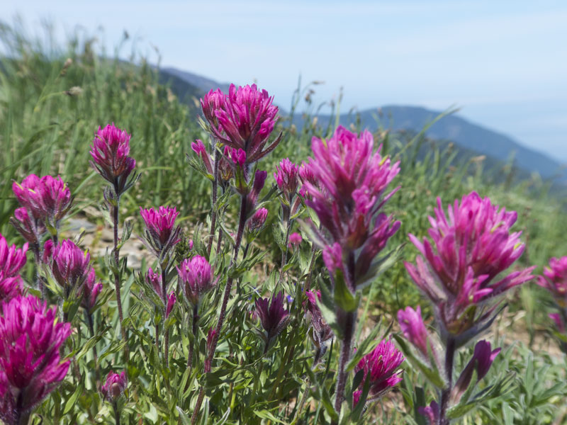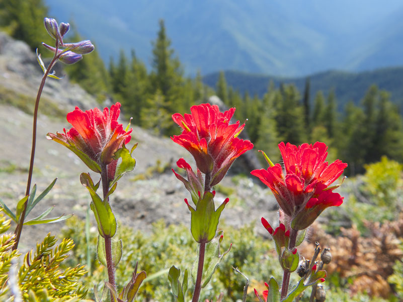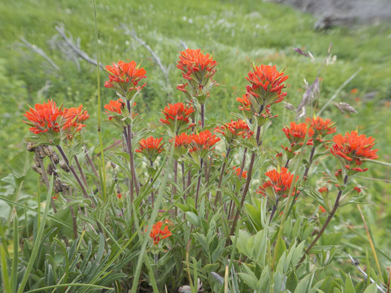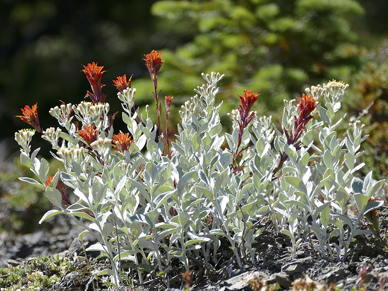 Paintbrush species in scarlet, orange or magenta make a vivid contribution to the color combinations seen in the wildflower meadows of the Olympics. Surprisingly, the brightly colored parts of paintbrush are not flowers but are modified leaves (bracts) that enclose inconspicuous flowers.