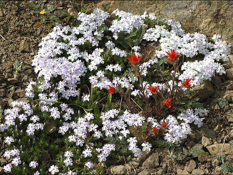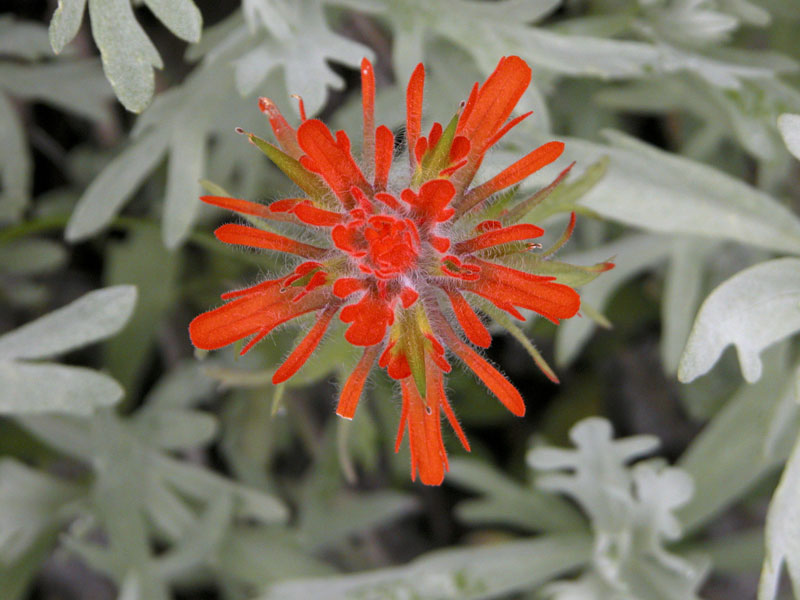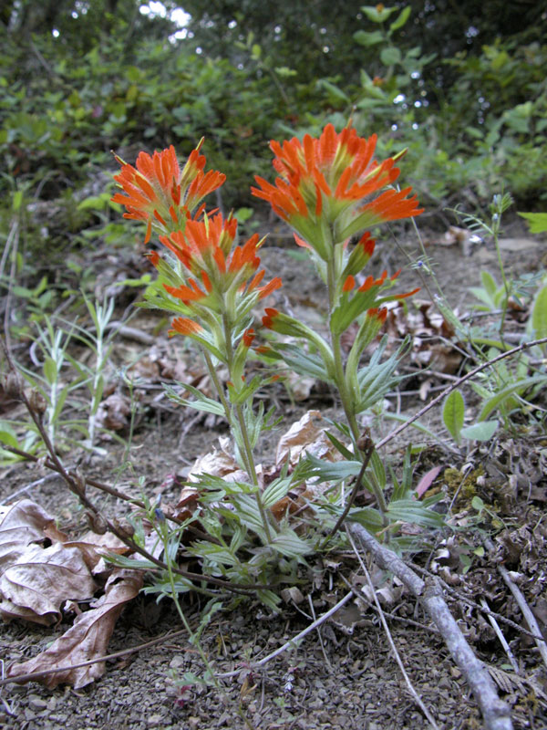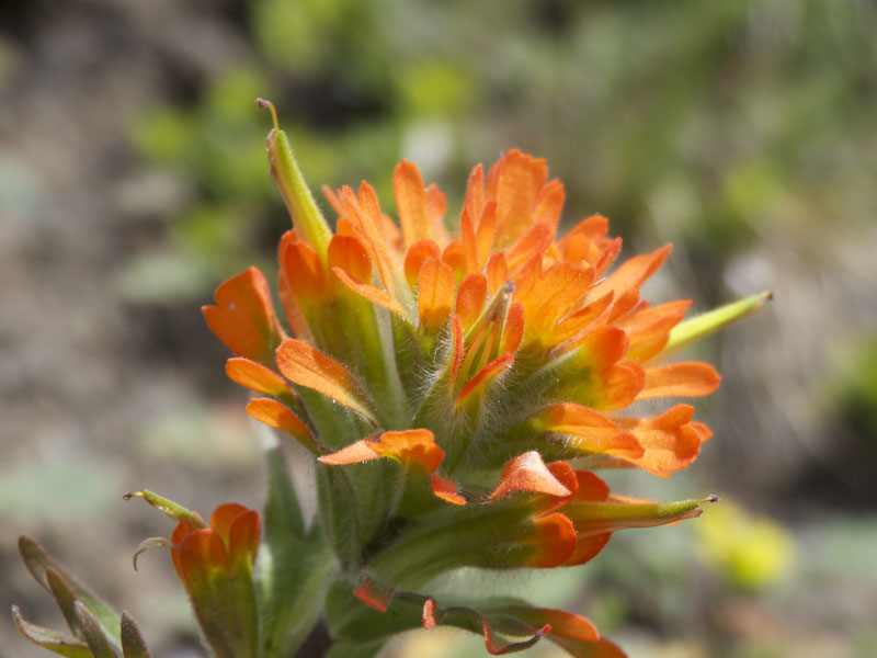 Paintbrush plants have an interesting relationship with nearby plants. Paintbrush roots invade the roots of nearby plants and take in sugars and other molecules made by these plants. The sugars taken from other plants supplement the sugar molecules made by the process of photosynthesis in the paintbrush’s own green leaves. Plants that both parasitize other plants and make their own sugars are called hemiparasitic. Naked Broomrape (see Wildflowers in the menu) is in the same family as Paintbrush, but is fully parasitic. It has no green parts, and makes no sugars of its own.