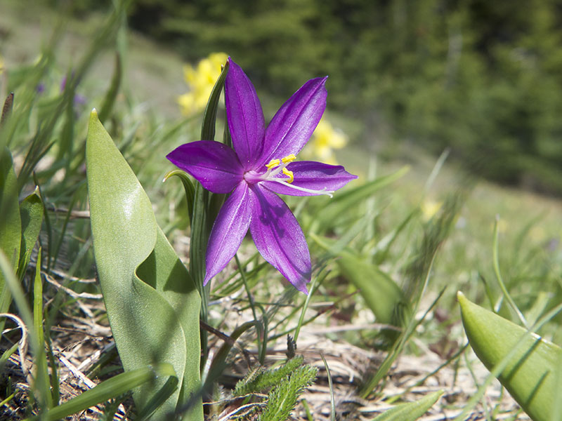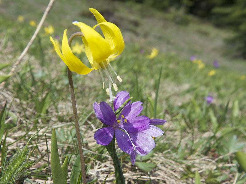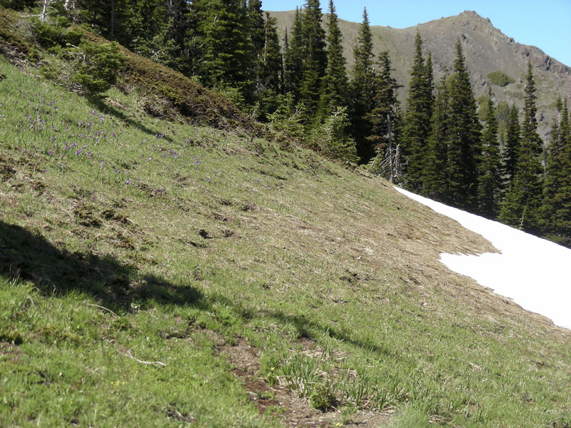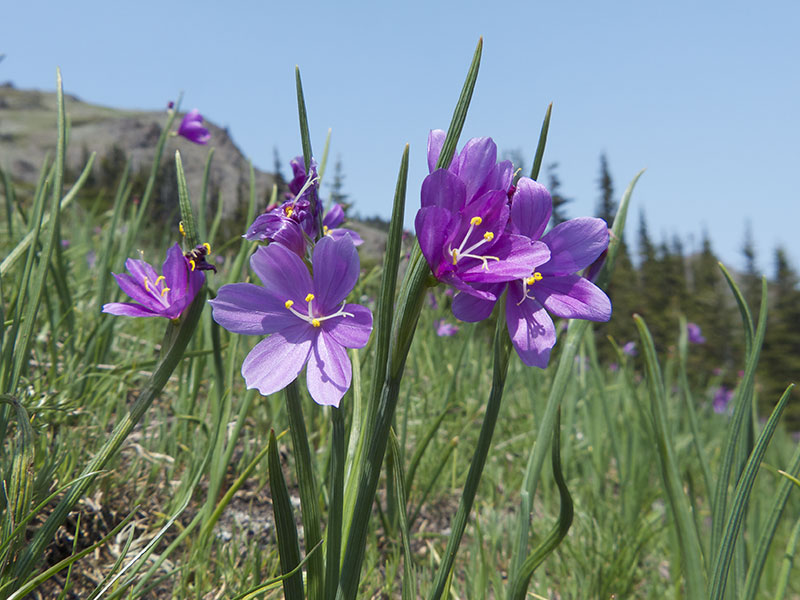 Both species of Blue-eyed Grass are listed in Plants of the Pacific Northwest Coast, Pojar and Mackinnon, 2004, as growing at low to middle elevations, but we’ve only seen and photographed it in north-sloping meadows below and east of the peak of Blue Mountain in Olympic National Park, just below 6,000 feet. It blooms days after the snow melts, just yards away from the retreating snow line. Sometimes Blue-eyed Grass and Glacier Lilly are intermixed. The blooms last only a short time.